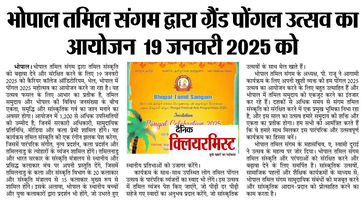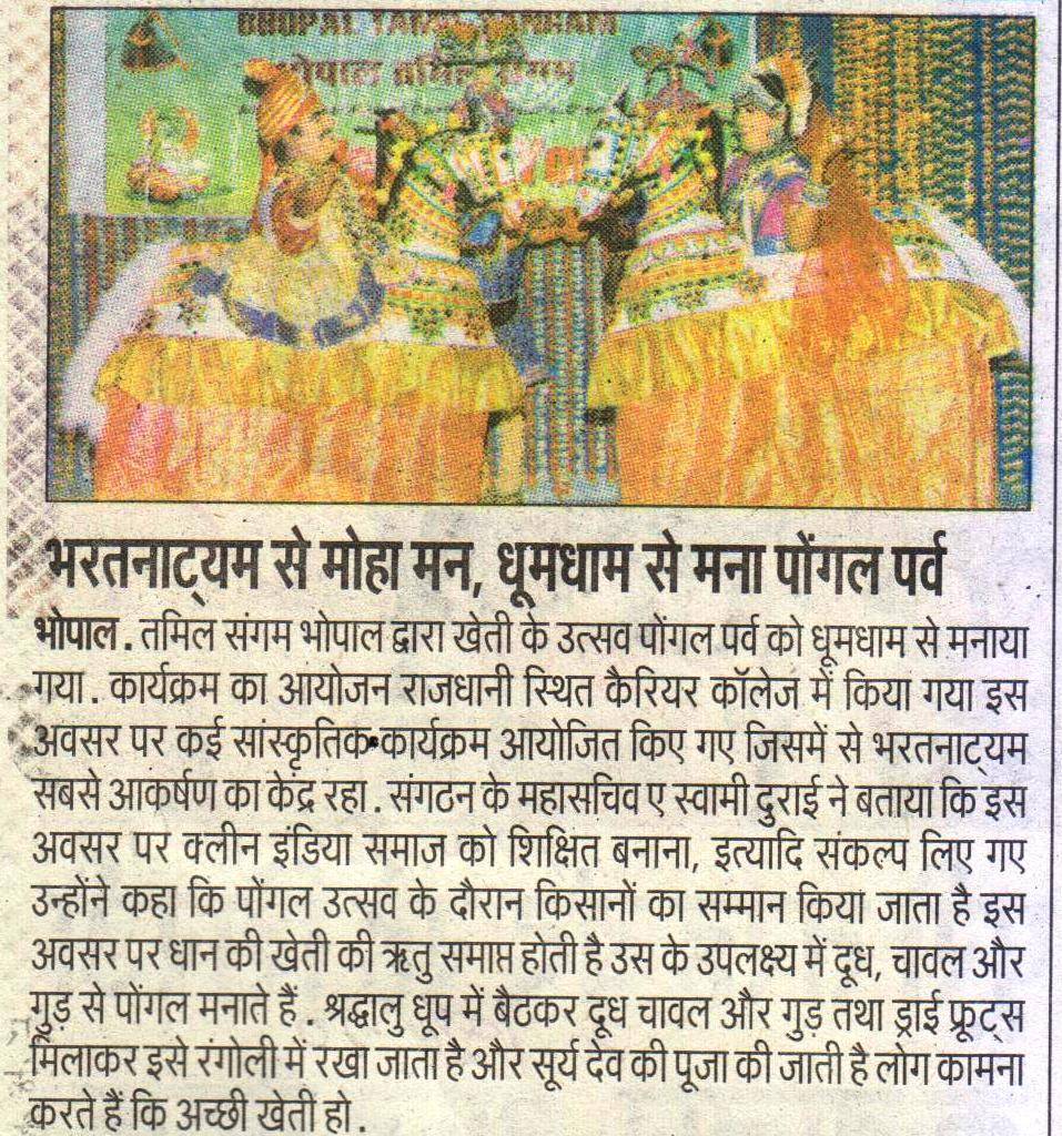 ஜனவரி 19 ஆம் நாள் 2020 ஆம் ஆண்டு போபால் தமிழ்ச் சங்கம் சார்பில் பொங்கல் விழா கொண்டாடப்பட்டது. இந்த பொங்கல் விழாவில் முதன்முறையாக போபாலின் வரலாற்றில், தமிழக அரசின் சார்பாக, தமிழ்நாடு இயல் இசை நாடக மன்றத்தால் அனுப்பப்பட்டது கிராமிய கலைக்குழு. இந்தக்குழுவின் பரத கலைஞர் பரத நாட்டியம் மிகச்சிறப்பாக ஆடினார்கள். கரகாட்டம் மற்றும் கிராமிய கலை நிகழ்ச்சிகள், நடனம், பாடல் மற்றும் கலைநிகழ்ச்சிகளை மக்கள் மனதை கவரும் வகையில் மிகச் சிறப்பாக வழங்கி சிறப்பித்தனர். நடன நிகழ்ச்சி விழா அரங்கை பார்வையாளர்களின் கரவோசையால் அதிர வைத்தது, பார்வையாளர்களை மகிழ்வித்தனர். போபாலில் நடத்திய முதல், தமிழக அரசின் சார்பாக அனுப்பப்பட்ட கிராமிய கலைக்குழு சரித்திரம் நாடகம் இது. தமிழக அரசு அனுப்பிய சிறந்த கலைஞர்களை கௌரவிக்கும் வாய்ப்பும் மற்றும் வருகை தந்த அதிகாரிகளை கௌரவிக்கும் அருமையான வாய்ப்பும் போபால் தமிழ்ச் சங்கத்திற்கு கிடைத்தது.