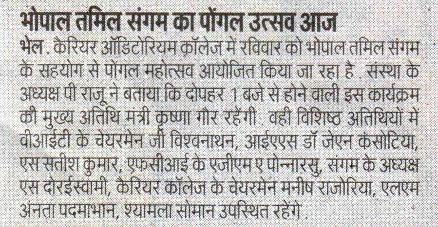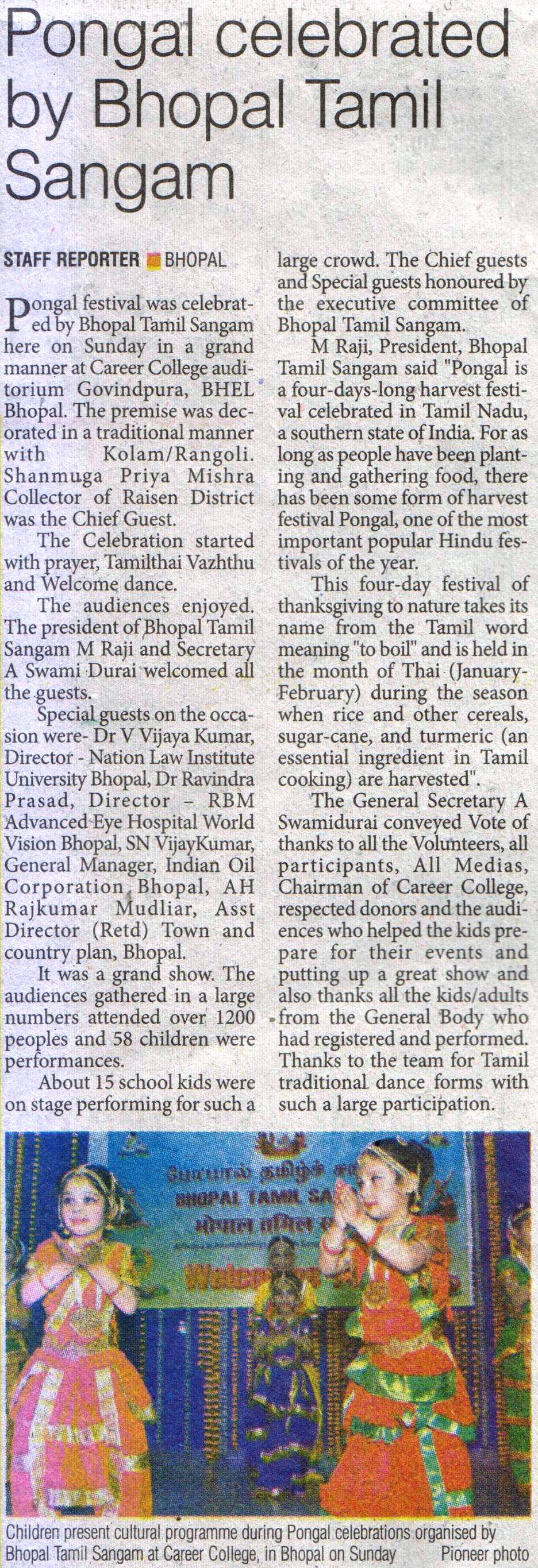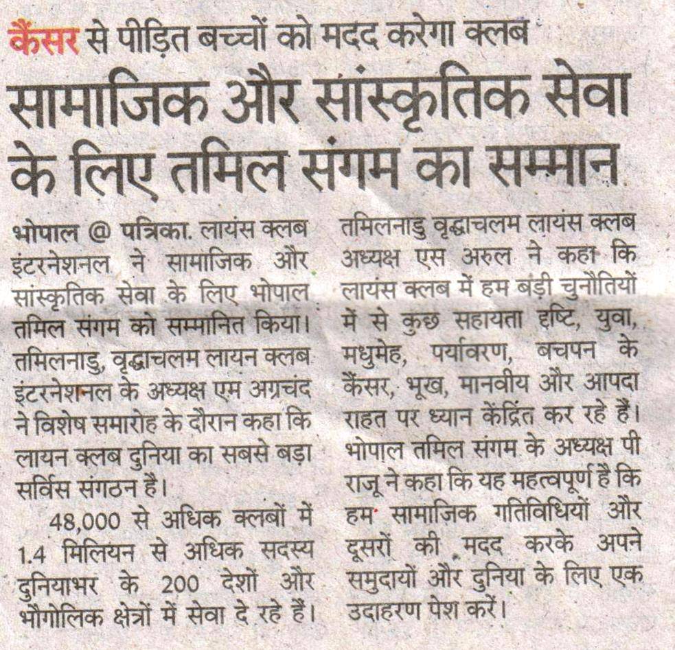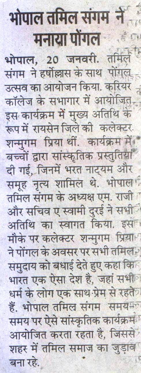 போபால் தமிழ்ச் சங்கம் தொடர்ந்து போபாலில் தமிழரின் அடையாளமாகவும் குரலாகவும் நிலைபெறத் தங்கள் ஆதரவே உயிர்நாடி. தங்கள் கருத்துகளை போபால் தமிழ்ச் சங்கத்தின் மின்னலங்சலுக்கு அனுப்பலாம். போபால் தமிழ்ச் சங்கம் என்றும் என்றும் நெஞ்சார்ந்த நன்றியை வணக்கத்துடன் தெரிவித்துக்கொள்ளும். இந்த அமைப்பின் நலனுக்காக சுயநலம் பாராமல் உழைத்த அனைவரையும் நாங்கள் நெஞ்சாற நினைத்து ஒவ்வொருவருக்கும் நன்றிகள் தெரிவித்துக்கொள்கின்றோம். வாழ்க தமிழ்.