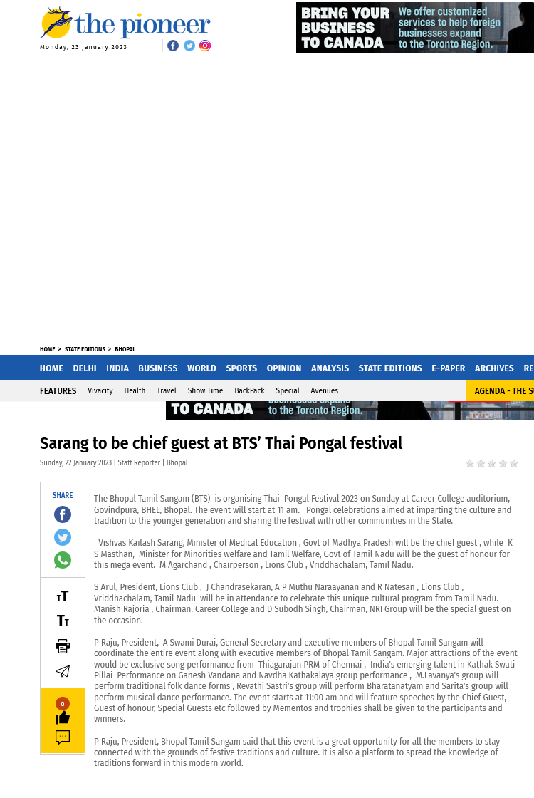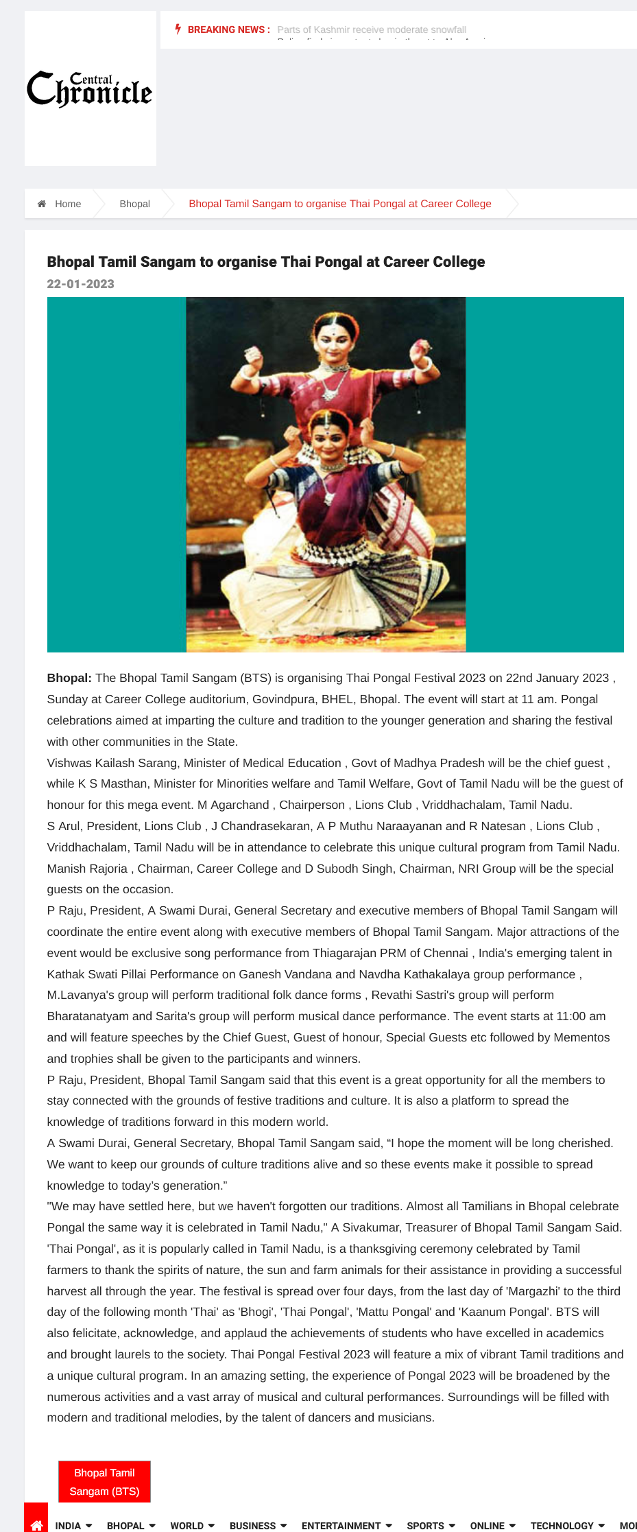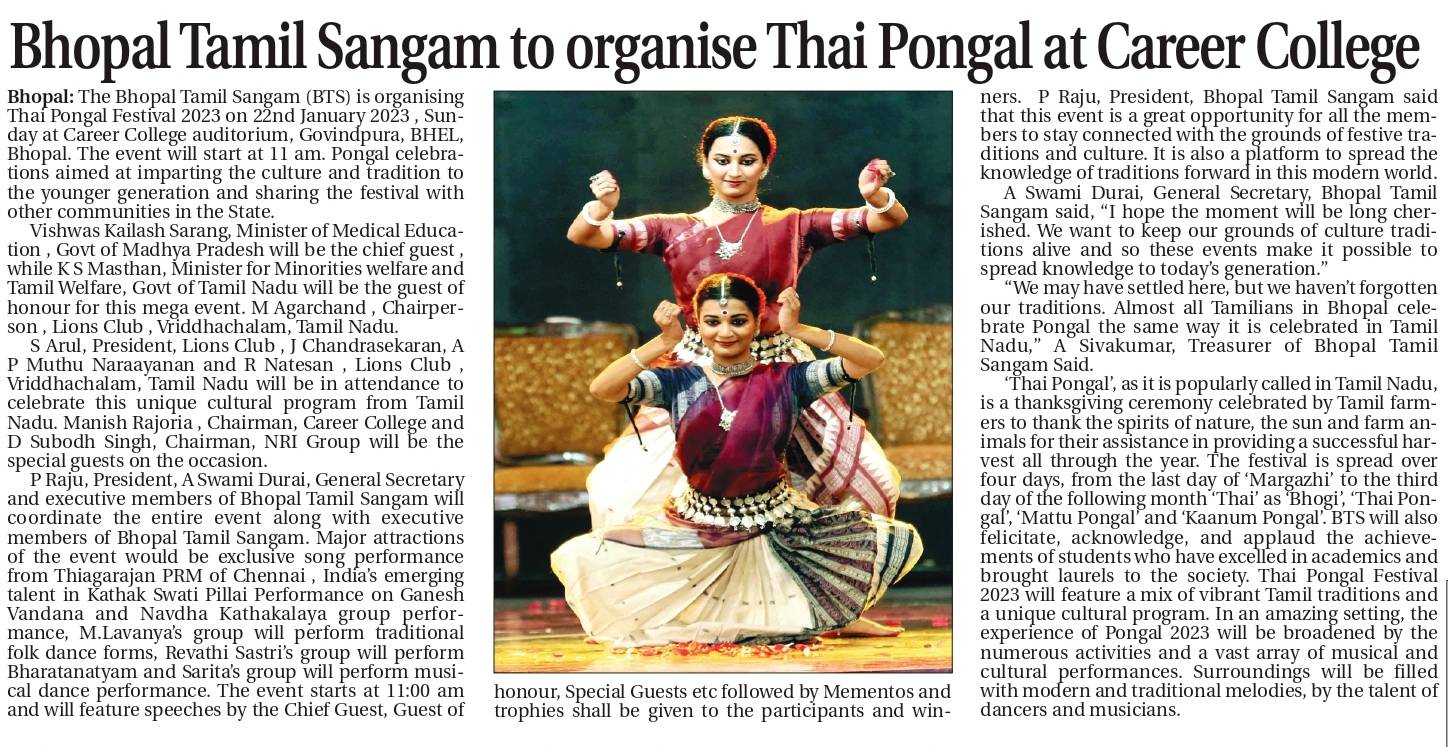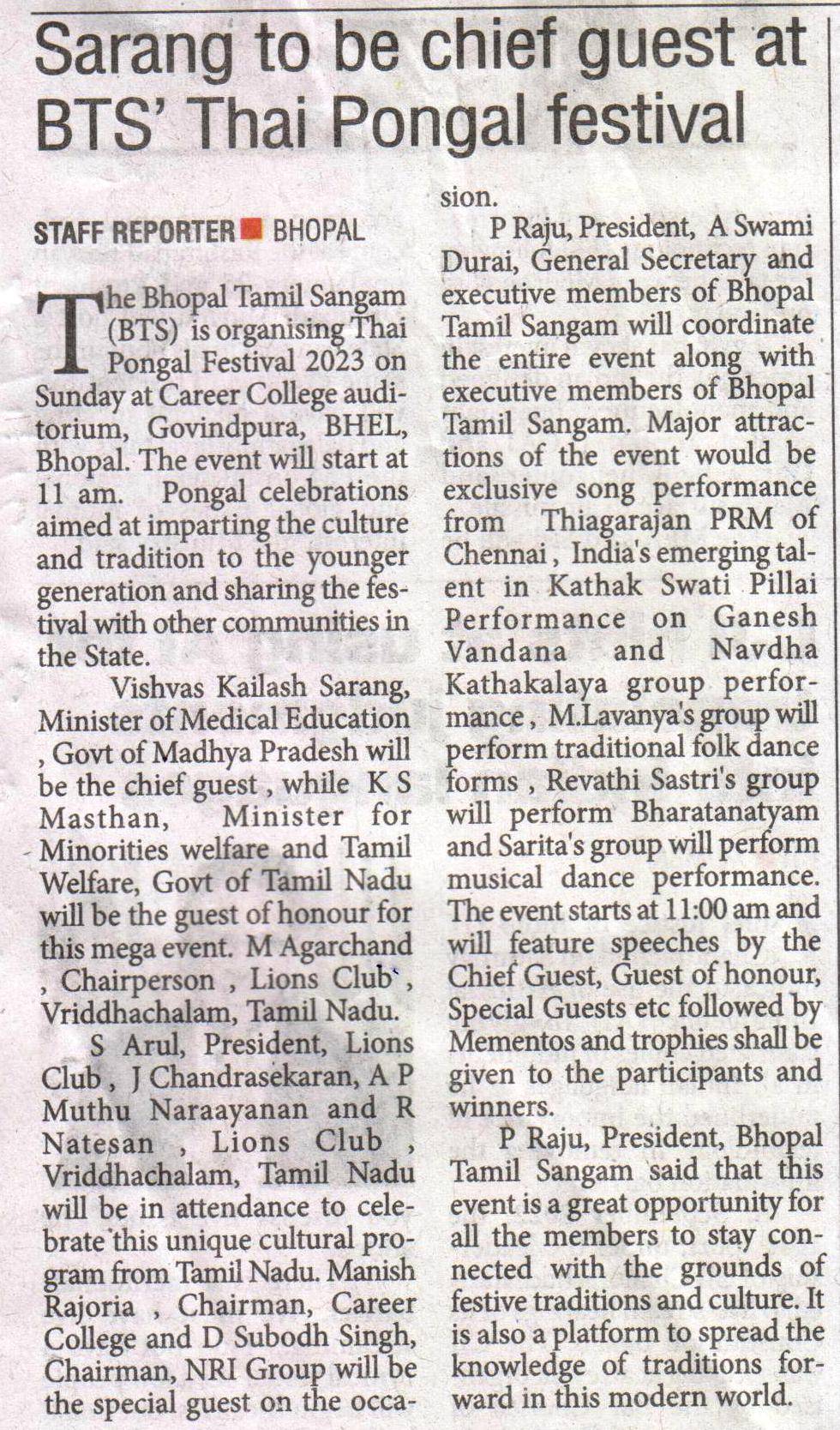 ஜனவரி 22 ஆம் நாள் 2023 ஆம் ஆண்டு போபால் தமிழ்ச் சங்கம் சார்பில் பொங்கல் விழா கொண்டாடப்பட்டது. இந்த பொங்கல் விழாவில் முதன்முறையாக போபாலின் வரலாற்றில், தமிழக அரசின் சார்பாக, தமிழக அரசு அனுப்பிய அயலகத் தமிழர் நலத்துறை மாண்புமிகு அமைச்சர் செஞ்சி திரு கே.எஸ்.மஸ்தான் அவர்கள் பிரதம விருந்தினராக விழாவில் பங்கேற்றார். மத்தியப் பிரதேசம் அரசின் சார்பாக மருத்துவக் கல்வி துறை மாண்புமிகு அமைச்சர் திரு விஸ்வாஸ் கைலாஷ் சாரங் அவர்கள் சிறப்பு விருந்தினராக விழாவில் பங்கேற்றார். மாநாட்டுத் தலைவர் லயன் கிளப், நிர்வாக இயக்குநர் ஸ்ரீ ஜெயின் ஜூவல்லரி பிரைவேட் லிமிடெட் MJF லயன் எம். அகர்சந்த் அவர்கள் சிறப்பு விருந்தினராக விழாவில் பங்கேற்றார். விருத்தாசலம் தமிழ்நாடு லயன் கமிட்டி குழுவினர்கள் சிறப்பு விருந்தினராக விழாவில் பங்கேற்றார்கள் மற்றும் பல்வேறு ஆட்சியாளர்கள் சிறப்பு விருந்தினராக விழாவில் பங்கேற்றார்கள். மாநாட்டுத் தலைவர் லயன் கிளப் நிர்வாக இயக்குநர் ஸ்ரீ ஜெயின் ஜூவல்லரி பிரைவேட் லிமிடெட் MJF லயன் எம். அகர்சந்த் அவர்கள் விழாவில் கலந்து கொண்டு சமூக மற்றும் கலாச்சார சேவைக்காக பாராட்டி போபால் தமிழ் சங்கத்திற்கு வழங்கப்பட்ட சர்வதேச ஜனாதிபதியின் பாராட்டு சான்றிதழை எங்களுக்கு வழங்கியுள்ளனர். மாண்புமிகு அமைச்சர் செஞ்சி திரு கே.எஸ்.மஸ்தான் அவர்கள் பேசுகையில் போபால் தமிழ்ச் சங்கத்தை மிகவும் பெரிதும் பாராட்டினார். இரு மாநிலங்களுக்கான அமைச்சர்களும் போபால் தமிழ்ச் சங்கத்தின் கலை நிகழ்ச்சி விழாவில் கலந்து கொண்டது பெரு நிகழ்வாகும் அவர்களின் ஆதரவும் கிடைக்கப்பெற்ற சங்கமாக போபால் தமிழ்ச் சங்கம் எழுந்து நிற்கிறது. இரு மாநிலங்களுக்கான அமைச்சர்கள் கலந்துகொண்டு சிறப்பித்த இந்த மைல்கல் விழாவில் தமிழர்களின் வளர்ச்சியிலும் தமிழர்களின் பங்கு என்றும் என்றும் போற்றப்படும் என்று புகழ்ந்துரைத்தார்கள். மாணவ, மாணவிகளும் கிராமிய நடனமாடி பார்வையாளர்களை மகிழ்வித்தனர். சிறப்பு மிக்க இந்த மிகப்பெரிய விழாவில் போபால் தமிழ்ச் சங்கத்திற்க்கா தமிழ் மையம் கட்டுவதற்கு அன்பளிப்பு வழங்க ஏற்பாடுசெய்யலாம் என்று மாண்புமிகு அமைச்சர் செஞ்சி திரு கே.எஸ்.மஸ்தான் அவர்கள், மற்றும் MJF லயன் எம். அகர்சந்த் அவர்கள் உறுதி கூறினார்கள். மேடை கலைநிகழ்ச்சிகள் பார்வையாளருக்கு இரசிகர்களுக்கு ஒரு நல்விருந்தாக அமைந்தது என்பதற்கு முதல் காட்சி அரங்கு நிறைந்த பார்வையாளர்கள் காட்சியாக இருந்ததே சான்று. போபாலில் நடத்திய முதல் தமிழக அரசின் சார்பாக மாண்புமிகு அமைச்சர் அனுப்பப்பட்டது சரித்திரம் இது.